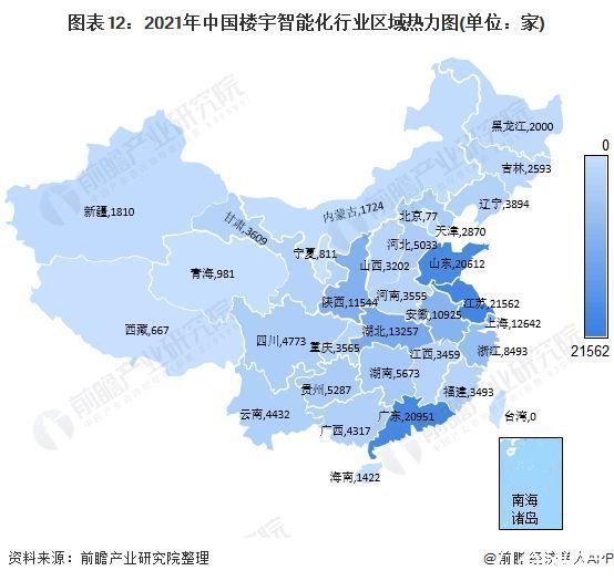 根据国家统计局2020年各省市房地产投资数据,目前楼宇智能化市场主要集中在广东、江苏、浙江、山东、河南和四川地区,占比分别为12.2%、10.0%、8.7%、7.2%、5.9%和5.6%。